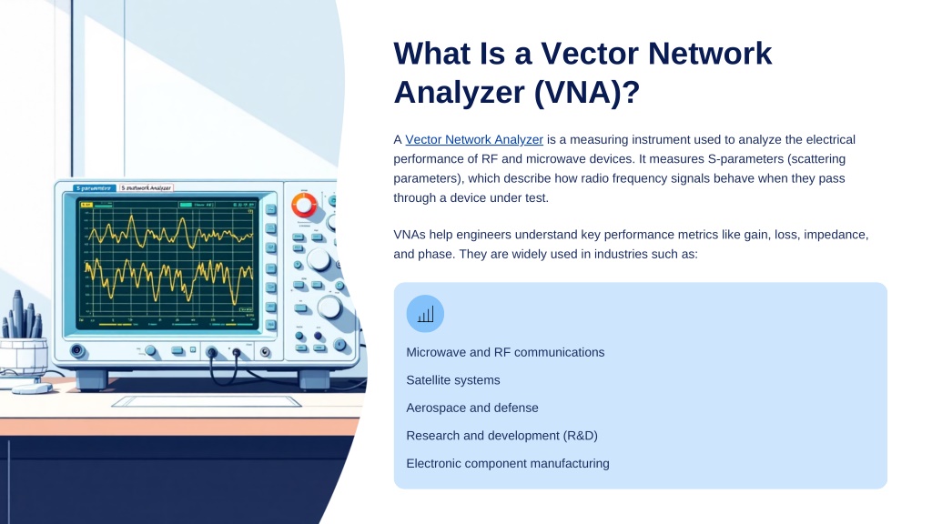 What Is a Vector Network Analyzer (VNA)? A Vector Network Analyzer is a measuring instrument used to analyze the electrical performance of RF and microwave devices. It measures S-parameters (scattering parameters), which describe how radio frequency signals behave when they pass through a device under test. VNAs help engineers understand key performance metrics like gain, loss, impedance, and phase. They are widely used in industries such as: Microwave and RF communications Satellite systems Aerospace and defense Research and development (R&D) Electronic component manufacturing