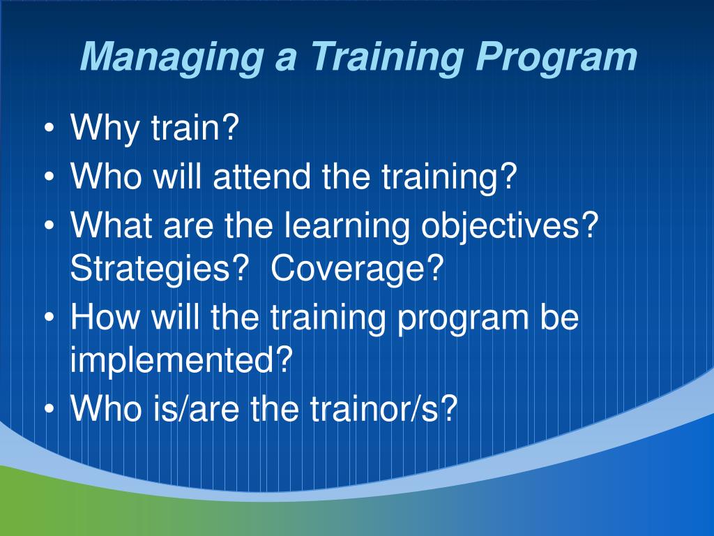 Managing a Training Program • Why train? • Who will attend the training? • What are the learning objectives? Strategies? Coverage? • How will the training program be implemented? • Who is/are the trainor/s?