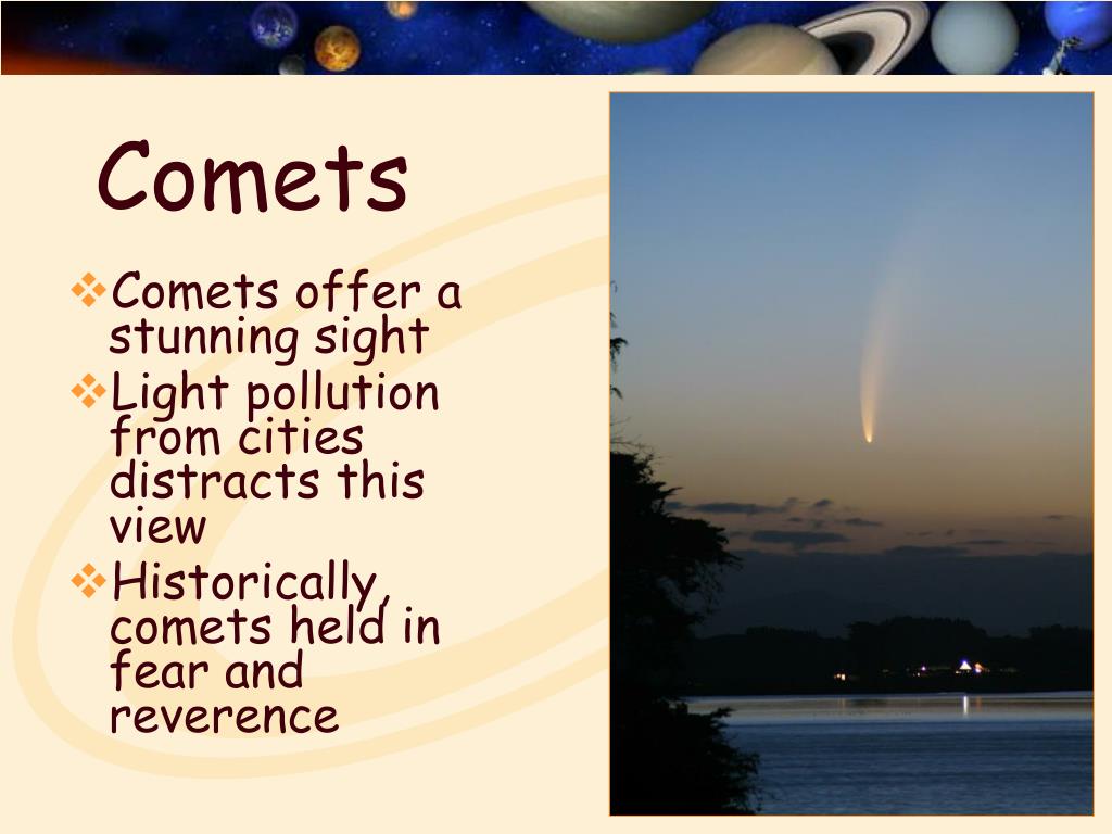 Comets • Comets offer a stunning sight • Light pollution from cities distracts this view • Historically, comets held in fear and reverence
