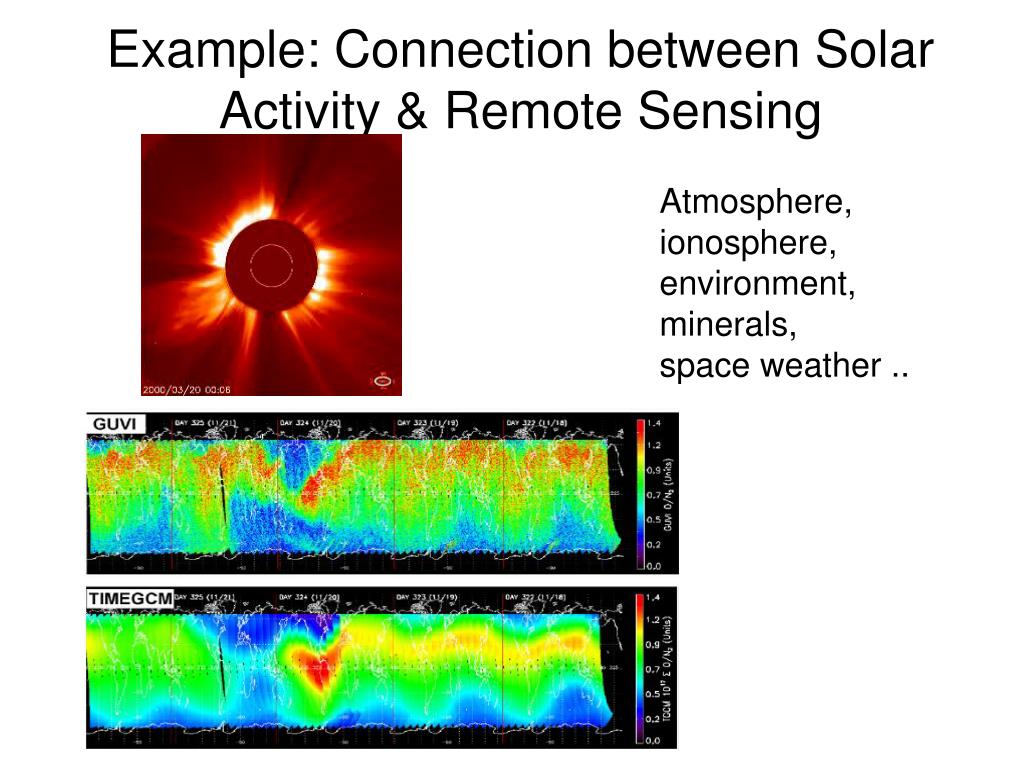 Example: Connection between Solar Activity & Remote Sensing Atmosphere, ionosphere, environment, minerals, space weather ..