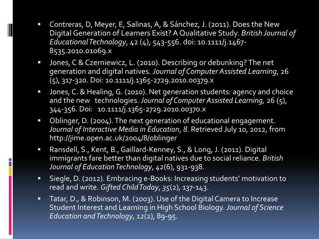 Contreras, D, Meyer, E, Salinas, A, & Sánchez, J. (2011). Does the New Digital Generation of Learners Exist? A Qualitative Study. British Journal of Educational Technology, 42 (4), 543-556. doi: 10.1111/j.1467-8535.2010.01069.x • Jones, C & Czerniewicz, L. (2010). Describing or debunking? The net generation and digital natives. Journal of Computer Assisted Learning, 26 (5), 317-320. Doi: 10.1111/j.1365-2729.2010.00379.x • Jones, C. & Healing, G. (2010). Net generation students: agency and choice and the new technologies. Journal of Computer Assisted Learning, 26 (5), 344-356. Doi: 10.1111/j.1365-2729.2010.00370.x • Oblinger, D. (2004). The next generation of educational engagement. Journal of Interactive Media in Education, 8. Retrieved July 10, 2012, from http://jime.open.ac.uk/2004/8/oblinger • Ransdell, S., Kent, B., Gaillard-Kenney, S., & Long, J. (2011). Digital immigrants fare better than digital natives due to social reliance. British Journal of Education Technology, 42(6), 931-938. • Siegle, D. (2012). Embracing e-Books: Increasing students’ motivation to read and write. Gifted Child Today, 35(2), 137-143. • Tatar, D., & Robinson, M. (2003). Use of the Digital Camera to Increase Student Interest and Learning in High School Biology. Journal of Science Education and Technology, 12(2), 89-95.