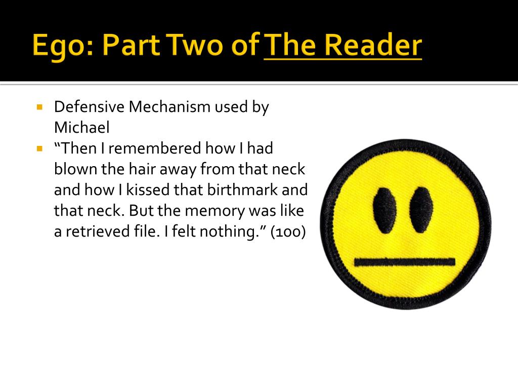 Ego: Part Two of The Reader • Defensive Mechanism used by Michael • “Then I remembered how I had blown the hair away from that neck and how I kissed that birthmark and that neck. But the memory was like a retrieved file. I felt nothing.” (100)