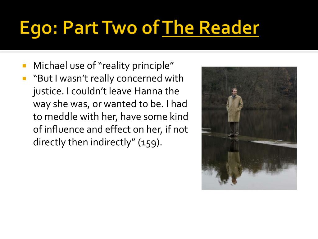 Ego: Part Two of The Reader • Michael use of “reality principle” • “But I wasn’t really concerned with justice. I couldn’t leave Hanna the way she was, or wanted to be. I had to meddle with her, have some kind of influence and effect on her, if not directly then indirectly” (159).