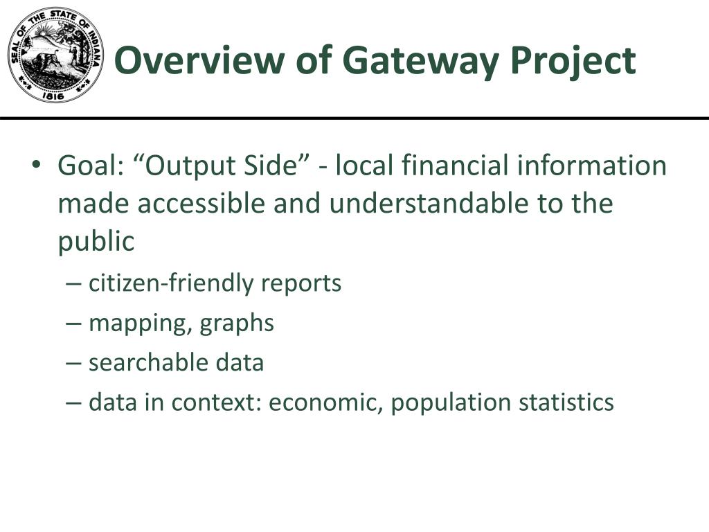 Goal: “Output Side” - local financial information made accessible and understandable to the public citizen-friendly reports mapping, graphs searchable data data in context: economic, population statistics Overview of Gateway Project