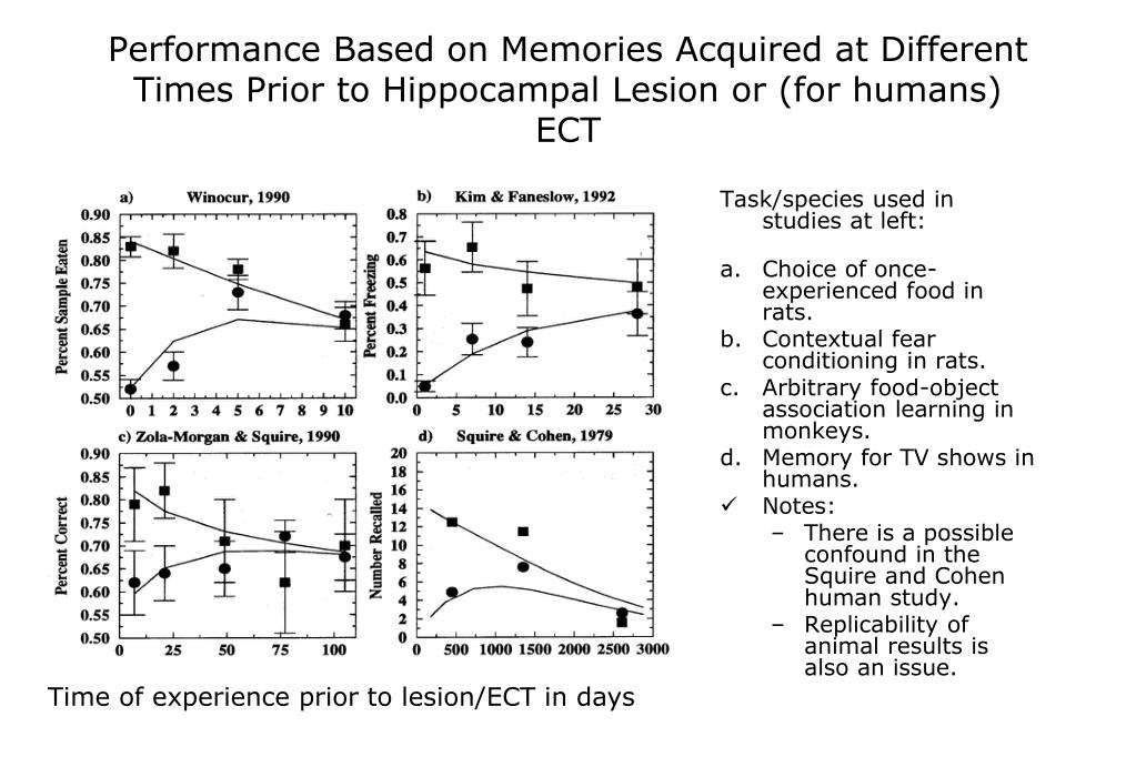 Performance Based on Memories Acquired at Different Times Prior to Hippocampal Lesion or (for humans) ECT Task/species used in studies at left: • Choice of once-experienced food in rats. • Contextual fear conditioning in rats. • Arbitrary food-object association learning in monkeys. • Memory for TV shows in humans. • Notes: • There is a possible confound in the Squire and Cohen human study. • Replicability of animal results is also an issue. Time of experience prior to lesion/ECT in days