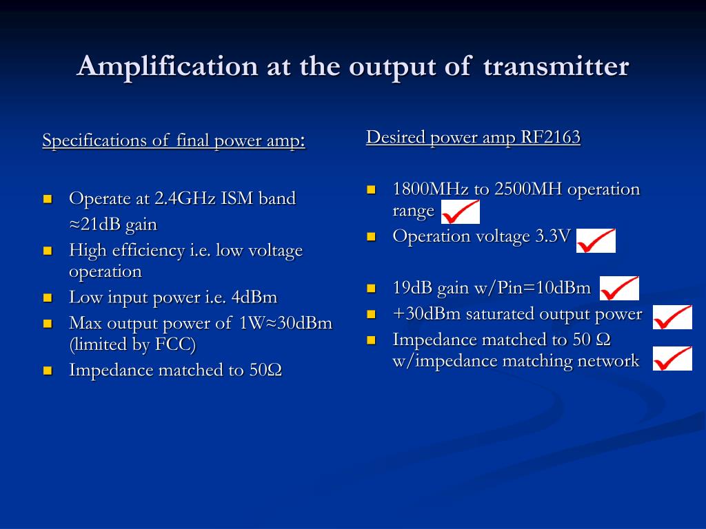 Specifications of final power amp: Operate at 2.4GHz ISM band ≈21dB gain High efficiency i.e. low voltage operation Low input power i.e. 4dBm Max output power of 1W≈30dBm (limited by FCC) Impedance matched to 50Ω Desired power amp RF2163 1800MHz to 2500MH operation range Operation voltage 3.3V 19dB gain w/Pin=10dBm +30dBm saturated output power Impedance matched to 50 Ω w/impedance matching network Amplification at the output of transmitter