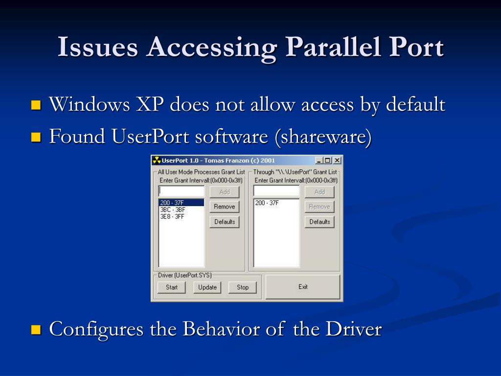 Issues Accessing Parallel Port • Windows XP does not allow access by default • Found UserPort software (shareware) • Configures the Behavior of the Driver