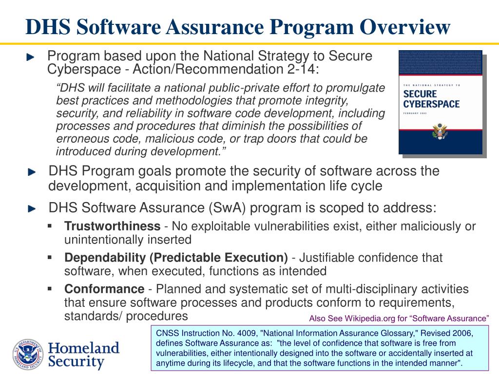 DHS Software Assurance Program Overview • Program based upon the National Strategy to Secure Cyberspace - Action/Recommendation 2-14: “DHS will facilitate a national public-private effort to promulgate best practices and methodologies that promote integrity, security, and reliability in software code development, including processes and procedures that diminish the possibilities of erroneous code, malicious code, or trap doors that could be introduced during development.” • DHS Program goals promote the security of software across the development, acquisition and implementation life cycle • DHS Software Assurance (SwA) program is scoped to address: • Trustworthiness - No exploitable vulnerabilities exist, either maliciously or unintentionally inserted • Dependability (Predictable Execution) - Justifiable confidence that software, when executed, functions as intended • Conformance - Planned and systematic set of multi-disciplinary activities that ensure software processes and products conform to requirements, standards/ procedures Also See Wikipedia.org for “Software Assurance” CNSS Instruction No. 4009, "National Information Assurance Glossary," Revised 2006, defines Software Assurance as: "the level of confidence that software is free from vulnerabilities, either intentionally designed into the software or accidentally inserted at anytime during its lifecycle, and that the software functions in the intended manner".
