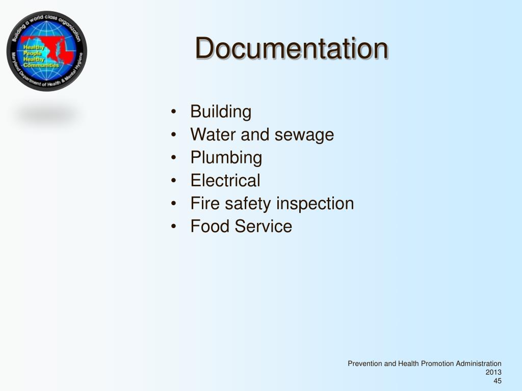 Documentation • Building • Water and sewage • Plumbing • Electrical • Fire safety inspection • Food Service