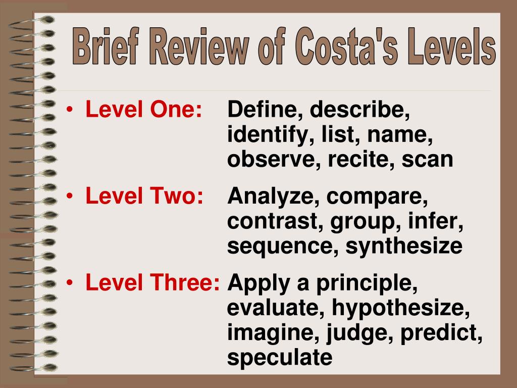 Brief Review of Costa's Levels • Level One: Define, describe, identify, list, name, observe, recite, scan • Level Two: Analyze, compare, contrast, group, infer, sequence, synthesize • Level Three: Apply a principle, evaluate, hypothesize, imagine, judge, predict, speculate