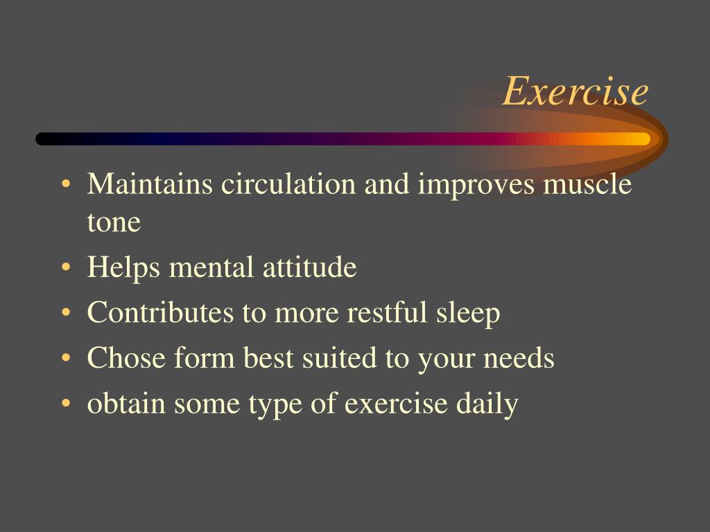 Exercise • Maintains circulation and improves muscle tone • Helps mental attitude • Contributes to more restful sleep • Chose form best suited to your needs • obtain some type of exercise daily