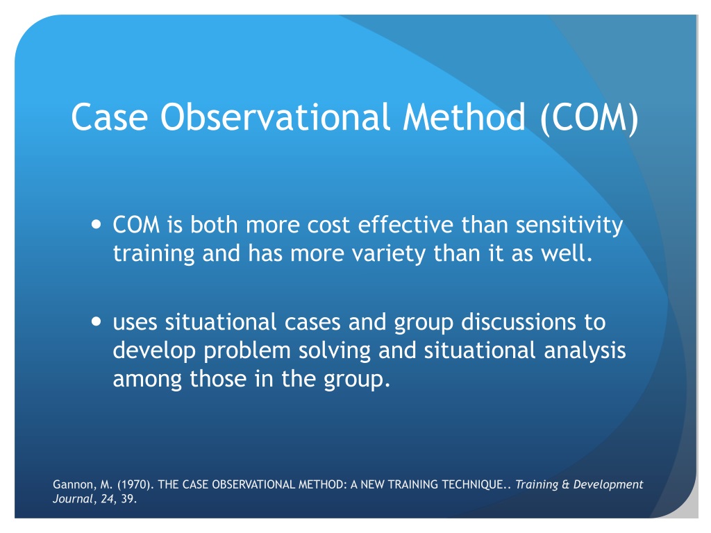 Case Observational Method (COM) • COM is both more cost effective than sensitivity training and has more variety than it as well. • uses situational cases and group discussions to develop problem solving and situational analysis among those in the group. Gannon, M. (1970). THE CASE OBSERVATIONAL METHOD: A NEW TRAINING TECHNIQUE.. Training & Development Journal, 24, 39.