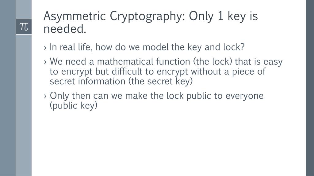 Asymmetric Cryptography: Only 1 key is needed. • In real life, how do we model the key and lock? • We need a mathematical function (the lock) that is easy to encrypt but difficult to encrypt without a piece of secret information (the secret key) • Only then can we make the lock public to everyone (public key)