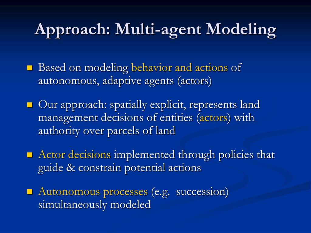 Approach: Multi-agent Modeling • Based on modeling behavior and actions of autonomous, adaptive agents (actors) • Our approach: spatially explicit, represents land management decisions of entities (actors) with authority over parcels of land • Actor decisions implemented through policies that guide & constrain potential actions • Autonomous processes (e.g. succession) simultaneously modeled
