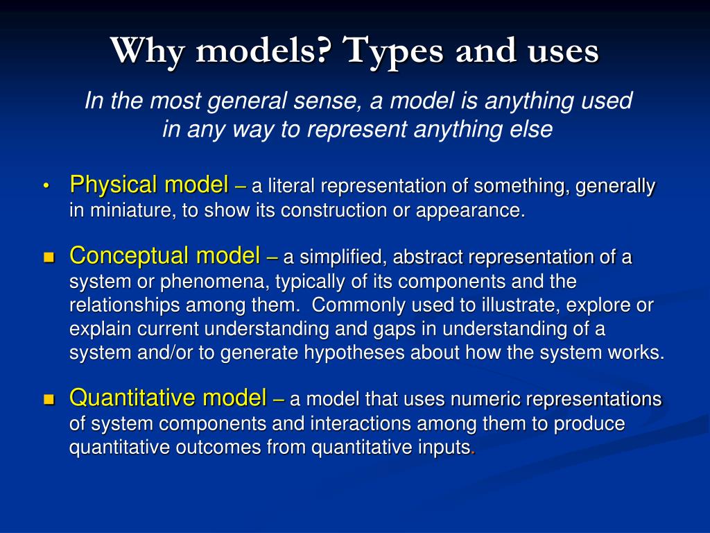 Why models? Types and uses In the most general sense, a model is anything used in any way to represent anything else • Physical model – a literal representation of something, generally in miniature, to show its construction or appearance. Conceptual model – a simplified, abstract representation of a system or phenomena, typically of its components and the relationships among them. Commonly used to illustrate, explore or explain current understanding and gaps in understanding of a system and/or to generate hypotheses about how the system works. Quantitative model – a model that uses numeric representations of system components and interactions among them to produce quantitative outcomes from quantitative inputs.