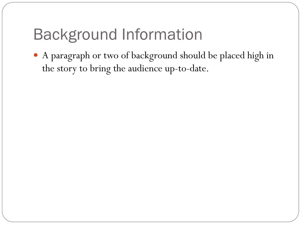 Background Information • A paragraph or two of background should be placed high in the story to bring the audience up-to-date.