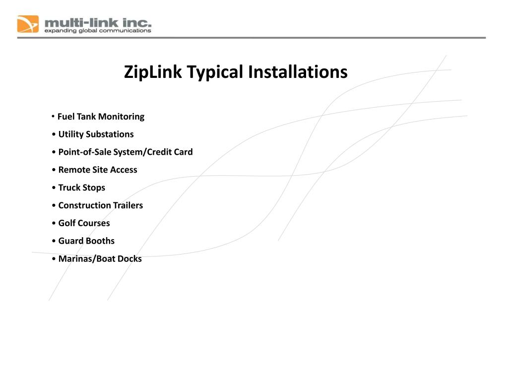 ZipLink Typical Installations • Fuel Tank Monitoring • Utility Substations • Point-of-Sale System/Credit Card • Remote Site Access • Truck Stops • Construction Trailers • Golf Courses • Guard Booths • Marinas/Boat Docks