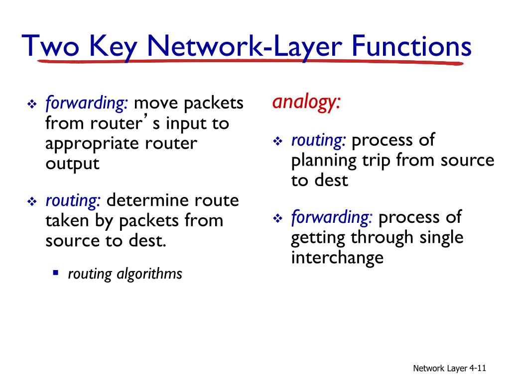 Two Key Network-Layer Functions analogy: • routing: process of planning trip from source to dest • forwarding: process of getting through single interchange • forwarding: move packets from router’s input to appropriate router output • routing: determine route taken by packets from source to dest. • routing algorithms Network Layer