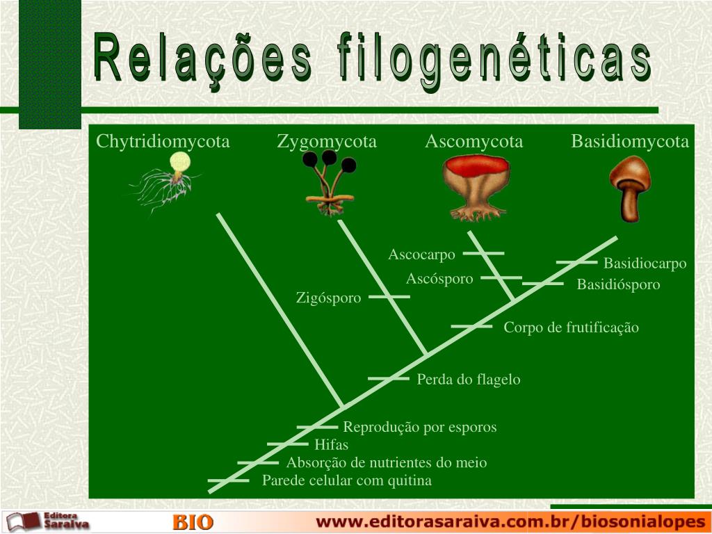 Chytridiomycota Zygomycota Ascomycota Basidiomycota Ascocarpo Basidiocarpo Ascósporo Basidiósporo Zigósporo Corpo de frutificação Perda do flagelo Reprodução por esporos Hifas Absorção de nutrientes do meio Parede celular com quitina Relações filogenéticas