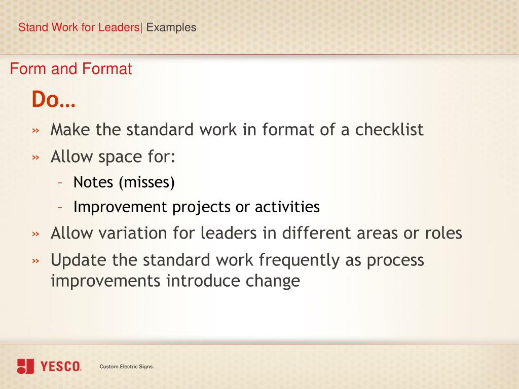 Stand Work for Leaders| Examples Form and Format Do… • Make the standard work in format of a checklist • Allow space for: • Notes (misses) • Improvement projects or activities • Allow variation for leaders in different areas or roles • Update the standard work frequently as process improvements introduce change