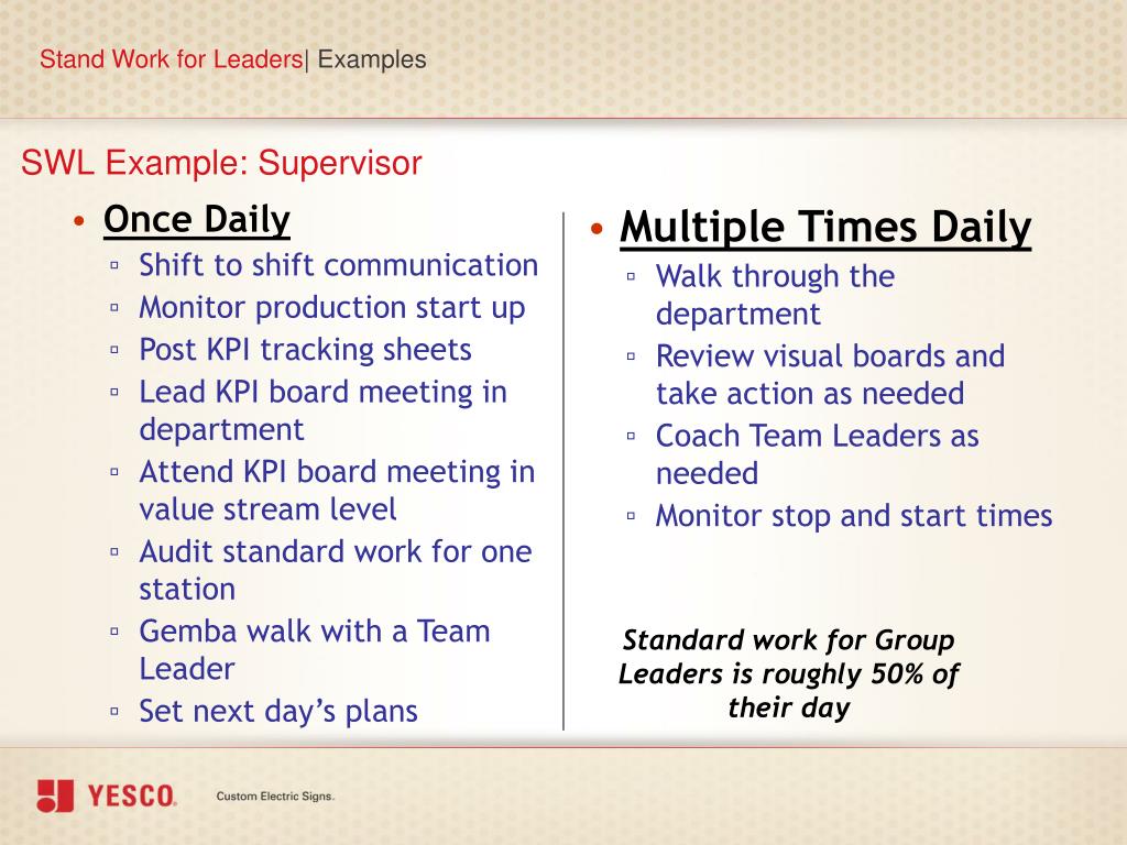 Stand Work for Leaders| Examples SWL Example: Supervisor • Once Daily • Shift to shift communication • Monitor production start up • Post KPI tracking sheets • Lead KPI board meeting in department • Attend KPI board meeting in value stream level • Audit standard work for one station • Gemba walk with a Team Leader • Set next day’s plans • Multiple Times Daily • Walk through the department • Review visual boards and take action as needed • Coach Team Leaders as needed • Monitor stop and start times Standard work for Group Leaders is roughly 50% of their day