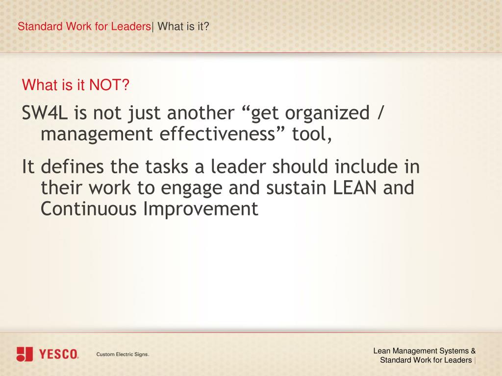 Standard Work for Leaders| What is it? What is it NOT? • SW4L is not just another “get organized / management effectiveness” tool, • It defines the tasks a leader should include in their work to engage and sustain LEAN and Continuous Improvement Lean Management Systems & Standard Work for Leaders |