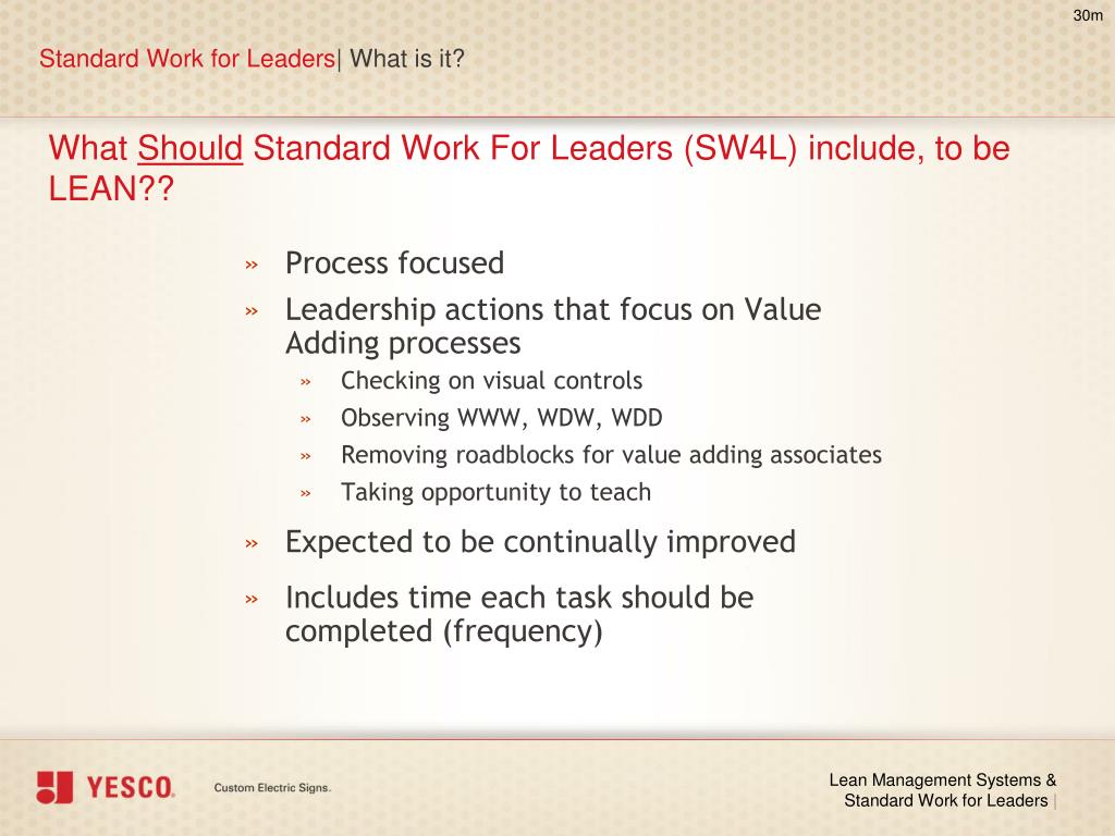 30m Standard Work for Leaders| What is it? What Should Standard Work For Leaders (SW4L) include, to be LEAN?? • Process focused • Leadership actions that focus on Value Adding processes • Checking on visual controls • Observing WWW, WDW, WDD • Removing roadblocks for value adding associates • Taking opportunity to teach • Expected to be continually improved • Includes time each task should be completed (frequency) Lean Management Systems & Standard Work for Leaders |