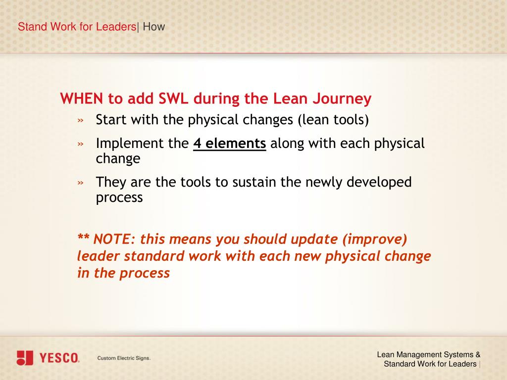 Stand Work for Leaders| How WHEN to add SWL during the Lean Journey • Start with the physical changes (lean tools) • Implement the 4 elements along with each physical change • They are the tools to sustain the newly developed process ** NOTE: this means you should update (improve) leader standard work with each new physical change in the process Lean Management Systems & Standard Work for Leaders |