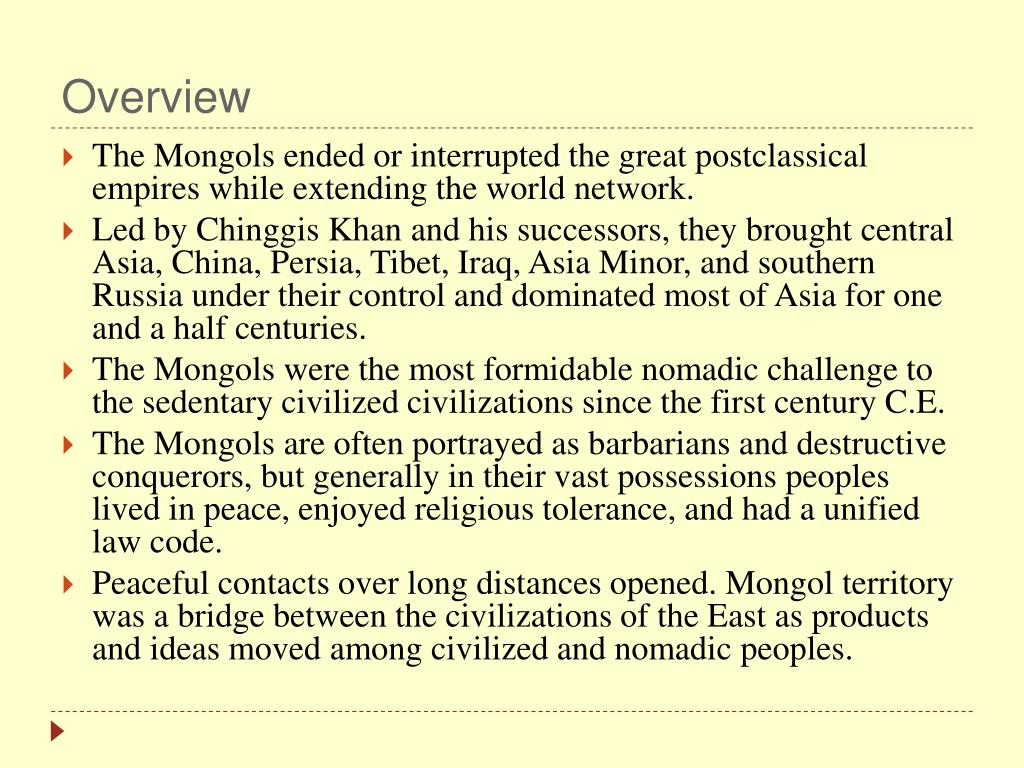 Overview • The Mongols ended or interrupted the great postclassical empires while extending the world network. • Led by Chinggis Khan and his successors, they brought central Asia, China, Persia, Tibet, Iraq, Asia Minor, and southern Russia under their control and dominated most of Asia for one and a half centuries. • The Mongols were the most formidable nomadic challenge to the sedentary civilized civilizations since the first century C.E. • The Mongols are often portrayed as barbarians and destructive conquerors, but generally in their vast possessions peoples lived in peace, enjoyed religious tolerance, and had a unified law code. • Peaceful contacts over long distances opened. Mongol territory was a bridge between the civilizations of the East as products and ideas moved among civilized and nomadic peoples.