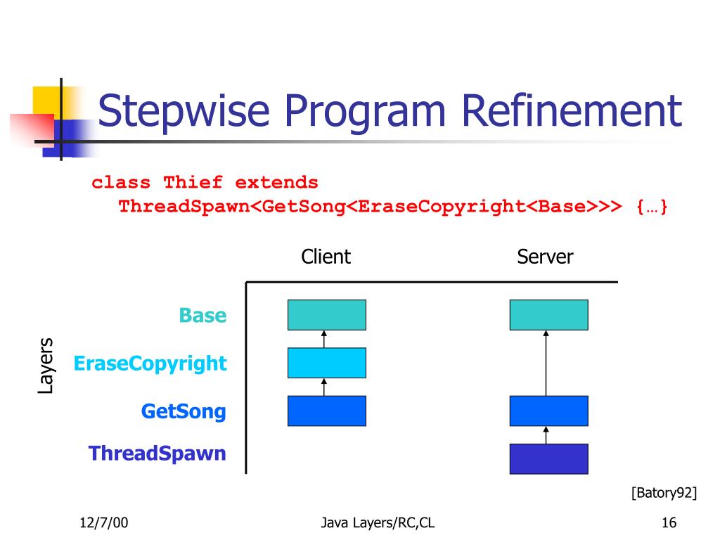EraseCopyright GetSong ThreadSpawn Stepwise Program Refinement class Thief extends ThreadSpawn<GetSong<EraseCopyright<Base>>> {…} Client Server Base Layers [Batory92] Java Layers/RC,CL