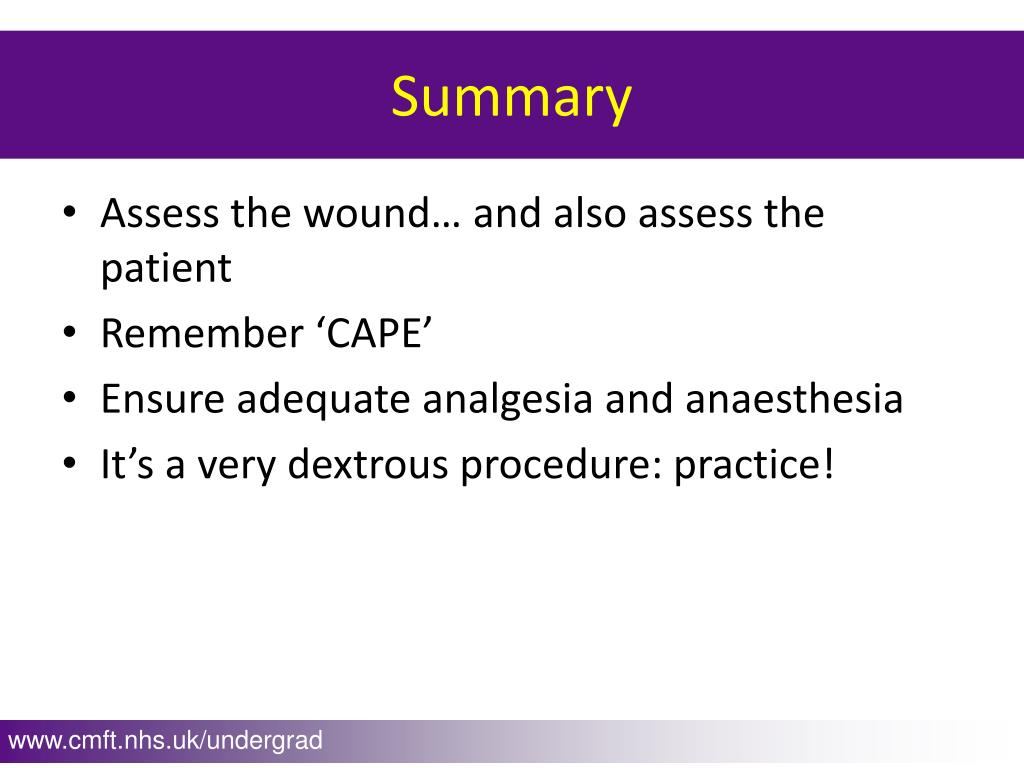 Summary • Assess the wound… and also assess the patient • Remember ‘CAPE’ • Ensure adequate analgesia and anaesthesia • It’s a very dextrous procedure: practice!