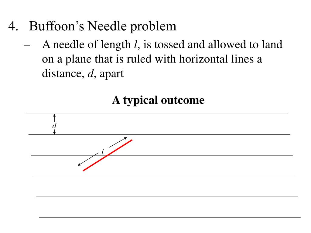 Buffoon’s Needle problem • A needle of length l, is tossed and allowed to land on a plane that is ruled with horizontal lines a distance, d, apart A typical outcome d l