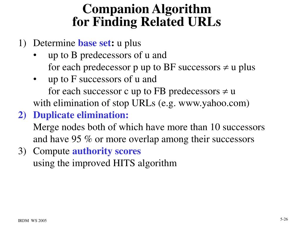 Finding Related URLs • Cocitation algorithm: • Determine up to B predecessors of given URL u • For each predecessor p determine up to BF successors u • Determine among all siblings s of u those • with the largest number of predecessors that • point to both s and u (degree of cocitation) • Companion algorithm: • Determine appropriate base set • for URL u („vicinity“ of u) • Apply HITS algorithm to this base set