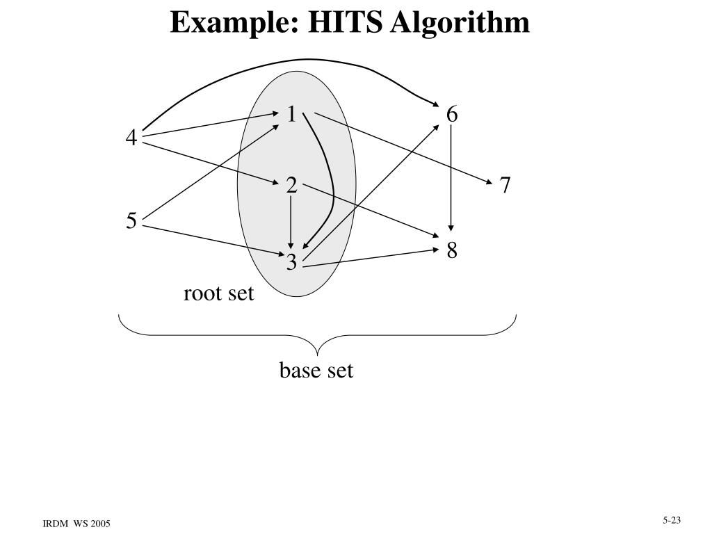 Example: HITS Algorithm 1 6 4 2 7 5 8 3 root set base set
