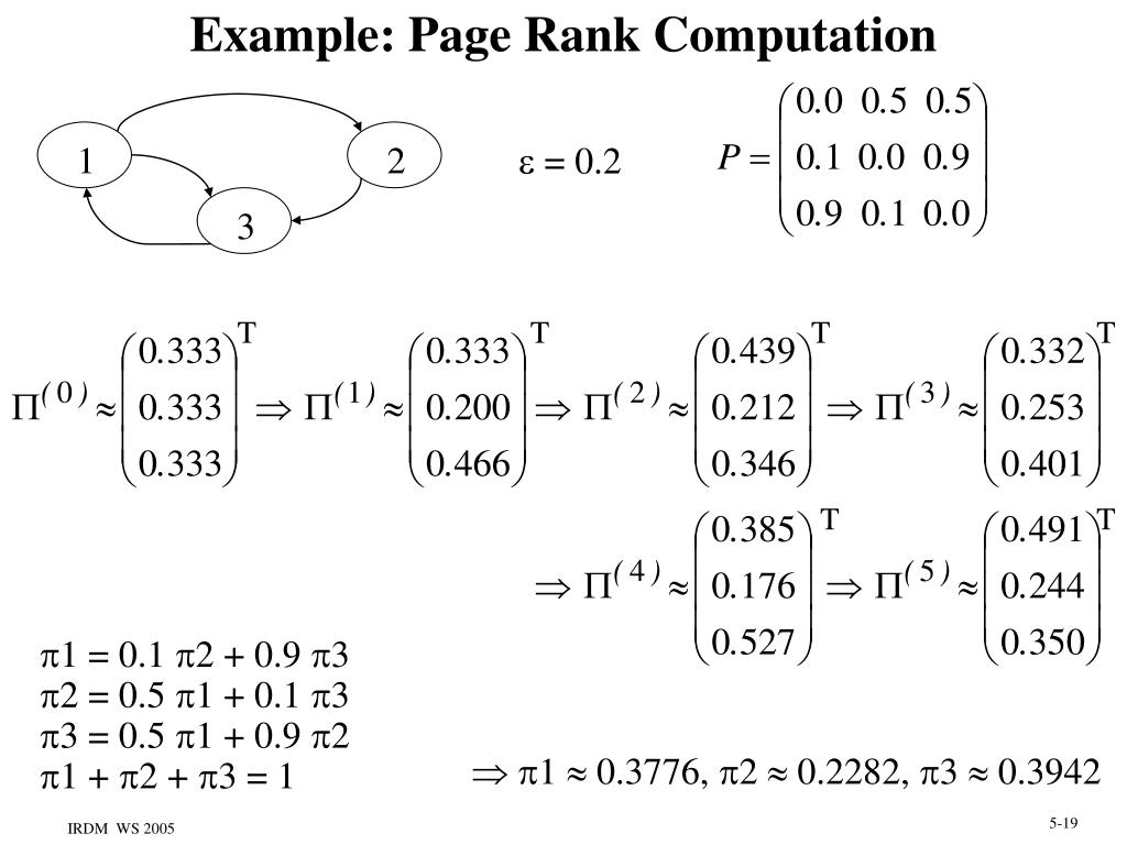 Example: Page Rank Computation 1 2 = 0.2 3 T T T T T T 1 = 0.1 2 + 0.9 3 2 = 0.5 1 + 0.1 3 3 = 0.5 1 + 0.9 2 1 + 2 + 3 = 1 1 0.3776, 2 0.2282, 3 0.3942