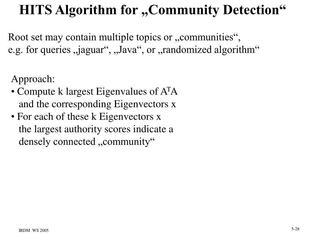 HITS Algorithm for „Community Detection“ Root set may contain multiple topics or „communities“, e.g. for queries „jaguar“, „Java“, or „randomized algorithm“ • Approach: • Compute k largest Eigenvalues of ATA • and the corresponding Eigenvectors x • For each of these k Eigenvectors x • the largest authority scores indicate a • densely connected „community“