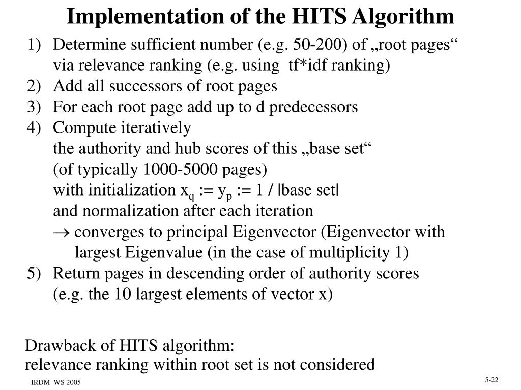 Determine sufficient number (e.g. 50-200) of „root pages“ • via relevance ranking (e.g. using tf*idf ranking) • Add all successors of root pages • For each root page add up to d predecessors • Compute iteratively • the authority and hub scores of this „base set“ • (of typically 1000-5000 pages) • with initialization xq := yp := 1 / |base set| • and normalization after each iteration • converges to principal Eigenvector (Eigenvector with • largest Eigenvalue (in the case of multiplicity 1) • Return pages in descending order of authority scores • (e.g. the 10 largest elements of vector x) Implementation of the HITS Algorithm Drawback of HITS algorithm: relevance ranking within root set is not considered