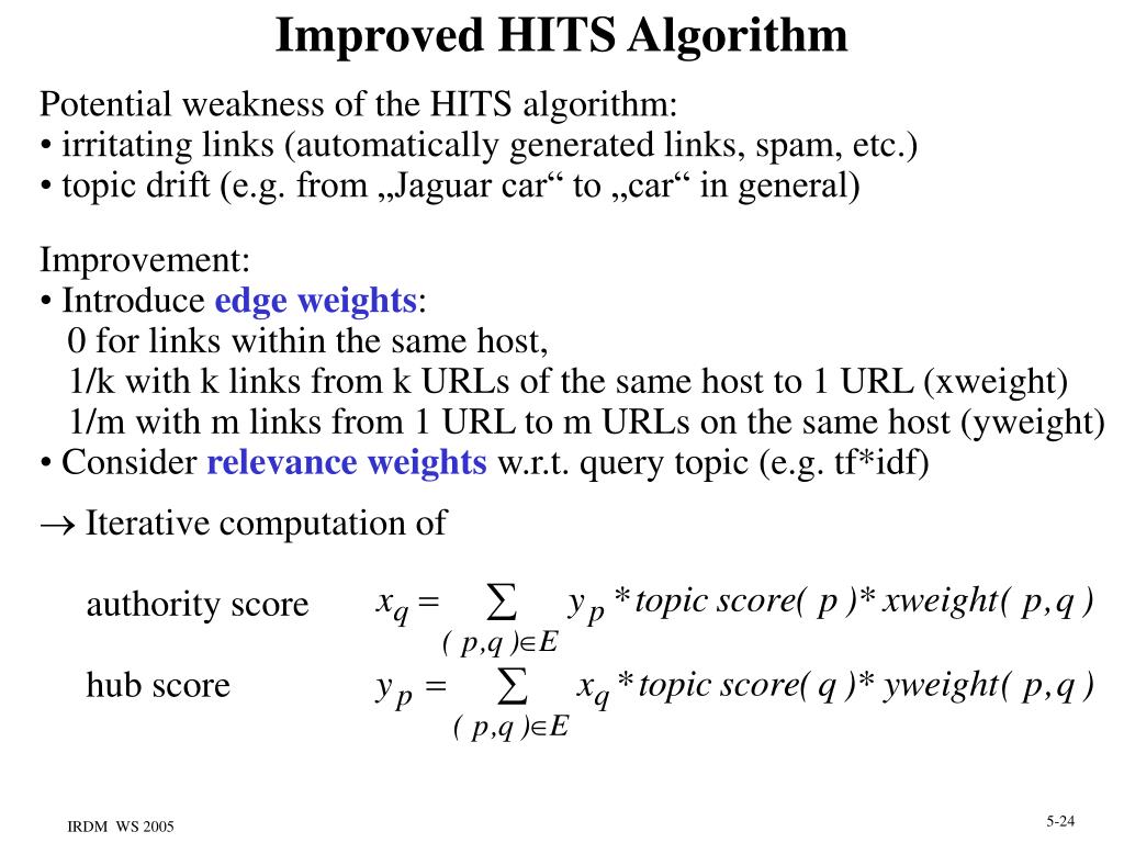 Improved HITS Algorithm • Potential weakness of the HITS algorithm: • irritating links (automatically generated links, spam, etc.) • topic drift (e.g. from „Jaguar car“ to „car“ in general) • Improvement: • Introduce edge weights: • 0 for links within the same host, • 1/k with k links from k URLs of the same host to 1 URL (xweight) • 1/m with m links from 1 URL to m URLs on the same host (yweight) • Consider relevance weights w.r.t. query topic (e.g. tf*idf) • Iterative computation of authority score hub score