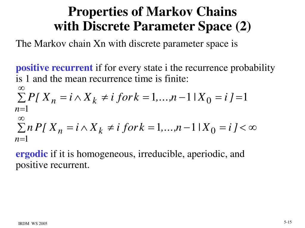 Properties of Markov Chainswith Discrete Parameter Space (2) The Markov chain Xn with discrete parameter space is positive recurrent if for every state i the recurrence probability is 1 and the mean recurrence time is finite: ergodic if it is homogeneous, irreducible, aperiodic, and positive recurrent.