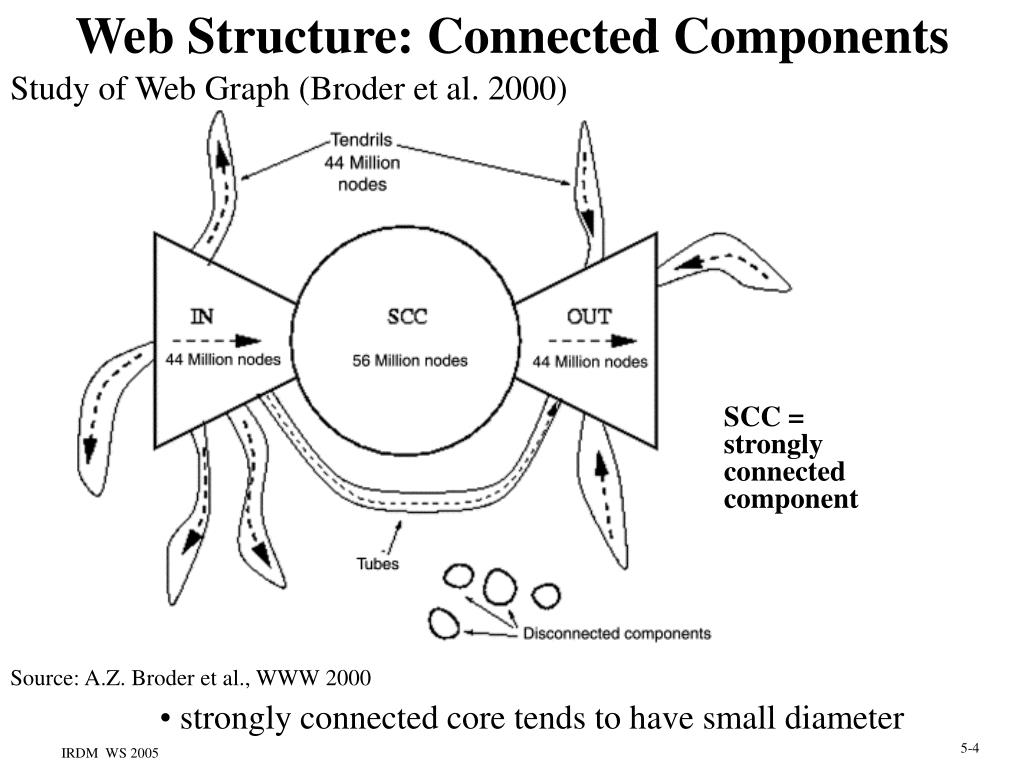 Study of Web Graph (Broder et al. 2000) Web Structure: Connected Components SCC = strongly connected component Source: A.Z. Broder et al., WWW 2000 • strongly connected core tends to have small diameter