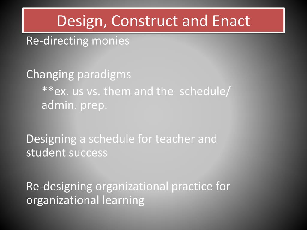 Design, Construct and Enact Re-directing monies Changing paradigms **ex. us vs. them and the schedule/ admin. prep. Designing a schedule for teacher and student success Re-designing organizational practice for organizational learning