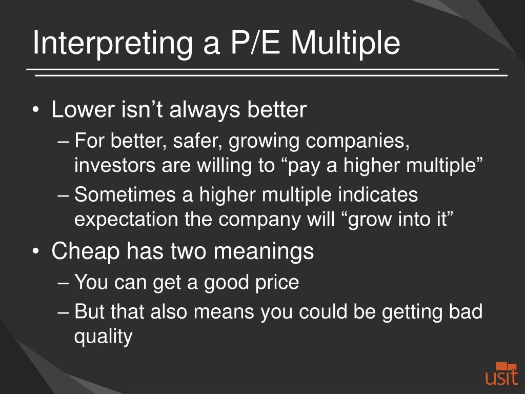 Interpreting a P/E Multiple • Lower isn’t always better • For better, safer, growing companies, investors are willing to “pay a higher multiple” • Sometimes a higher multiple indicates expectation the company will “grow into it” • Cheap has two meanings • You can get a good price • But that also means you could be getting bad quality