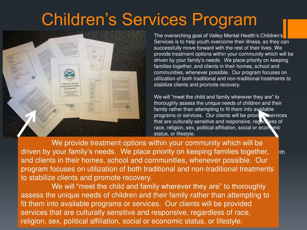 The overarching goal of Valley Mental Health’s Children’s Services is to help youth overcome their illness, so they can successfully move forward with the rest of their lives. We provide treatment options within your community which will be driven by your family’s needs. We place priority on keeping families together, and clients in their homes, school and communities, whenever possible. Our program focuses on utilization of both traditional and non-traditional treatments to stabilize clients and promote recovery. We will “meet the child and family wherever they are” to thoroughly assess the unique needs of children and their family rather than attempting to fit them into available programs or services. Our clients will be provided services that are culturally sensitive and responsive, regardless of race, religion, sex, political affiliation, social or economic status, or lifestyle. We will continue to develop and implement scientifically proven prevention and treatment services for children with mental health needs. Children’s Services Program We provide treatment options within your community which will be driven by your family’s needs. We place priority on keeping families together, and clients in their homes, school and communities, whenever possible. Our program focuses on utilization of both traditional and non-traditional treatments to stabilize clients and promote recovery. We will “meet the child and family wherever they are” to thoroughly assess the unique needs of children and their family rather than attempting to fit them into available programs or services. Our clients will be provided services that are culturally sensitive and responsive, regardless of race, religion, sex, political affiliation, social or economic status, or lifestyle.