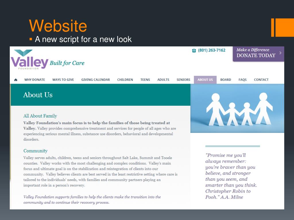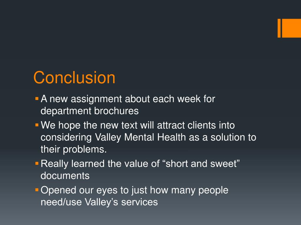 Conclusion • A new assignment about each week for department brochures • We hope the new text will attract clients into considering Valley Mental Health as a solution to their problems. • Really learned the value of “short and sweet” documents • Opened our eyes to just how many people need/use Valley’s services