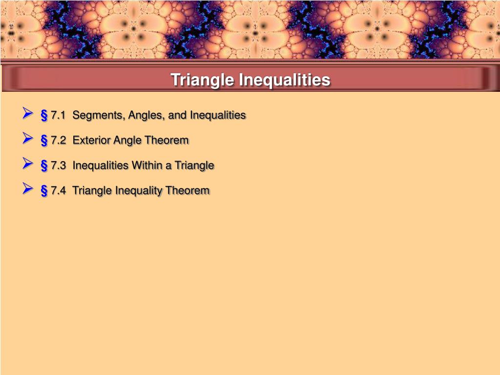 Triangle Inequalities • § 7.1 Segments, Angles, and Inequalities • § 7.2 Exterior Angle Theorem • § 7.3 Inequalities Within a Triangle • § 7.4 Triangle Inequality Theorem
