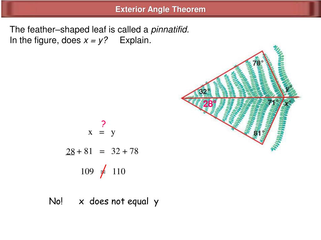 ? x = y Exterior Angle Theorem The feather–shaped leaf is called a pinnatifid. In the figure, does x = y? Explain. 28° __ + 81 = 32 + 78 28 109 = 110 No! x does not equal y
