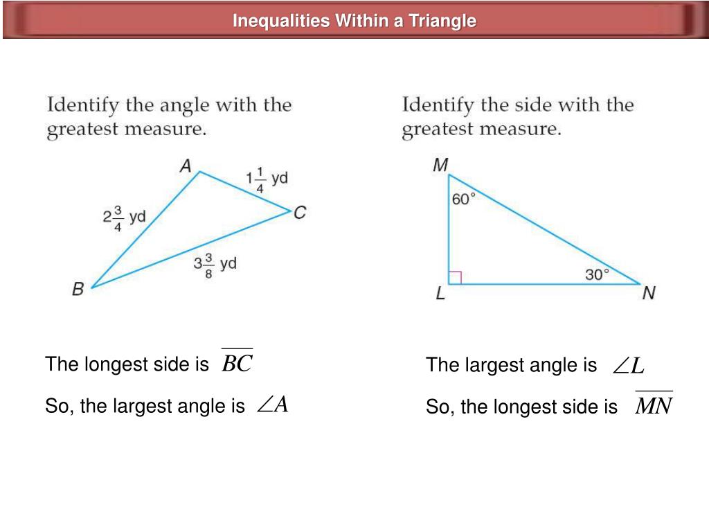 Inequalities Within a Triangle The longest side is The largest angle is So, the largest angle is So, the longest side is