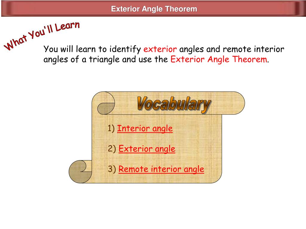 Vocabulary Exterior Angle Theorem What You'll Learn You will learn to identify exterior angles and remote interior angles of a triangle and use the Exterior Angle Theorem. 1) Interior angle 2) Exterior angle 3) Remote interior angle