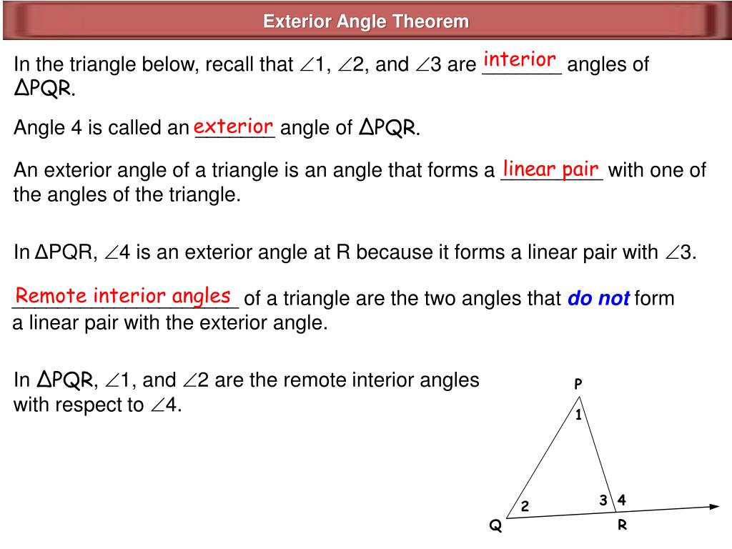 P 1 3 4 2 Q R Exterior Angle Theorem interior In the triangle below, recall that 1, 2, and 3 are _______ angles ofΔPQR. exterior Angle 4 is called an _______ angle of ΔPQR. linear pair An exterior angle of a triangle is an angle that forms a _________ with one of the angles of the triangle. In ΔPQR, 4 is an exterior angle at R because it forms a linear pair with 3. Remote interior angles ____________________ of a triangle are the two angles that do not form a linear pair with the exterior angle. In ΔPQR, 1, and 2 are the remote interior angles with respect to 4.
