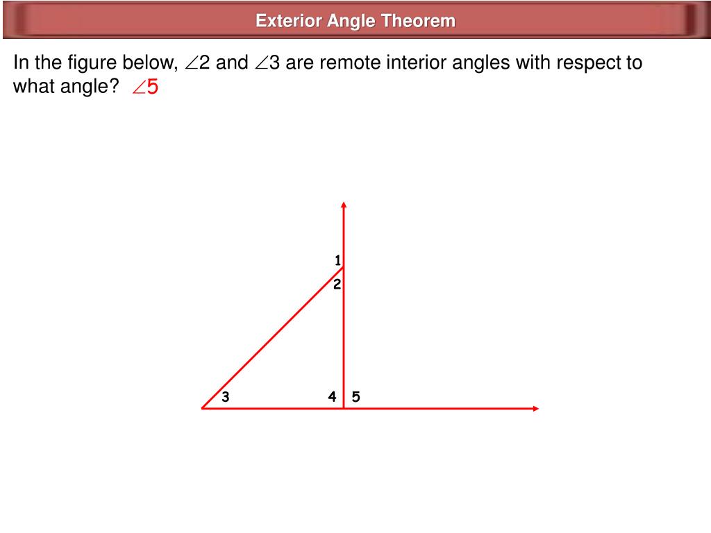 1 2 3 4 5 Exterior Angle Theorem In the figure below, 2 and 3 are remote interior angles with respect to what angle? 5